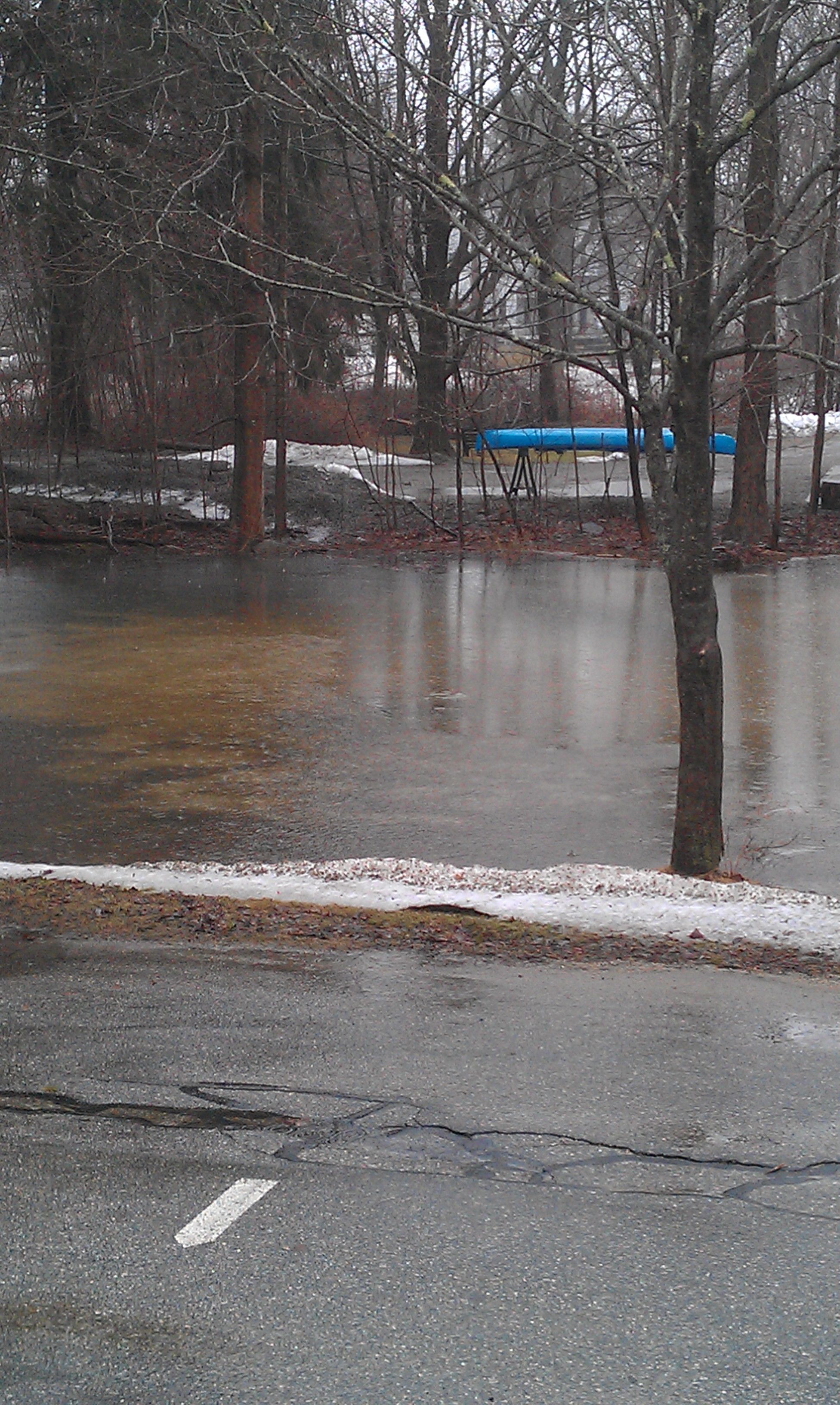 That is the backyard across the street from the church office. Last week kids were crunching through the snow playing some kind of game. Not it is a pond. I am assuming the blue canoe in the background is for when the water gets so high cars won’t be able to get through it. At the rate it is going, that will be Wednesday.