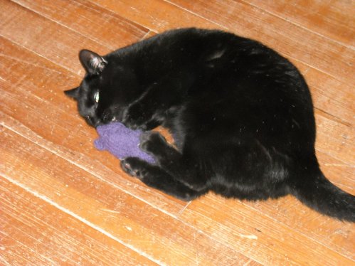 I bought a few, actually several, of the craft items. A few Christmas presents, a couple of items for me and a cat nip mouse for my cat, Cupid. He is in heaven…as you can see: