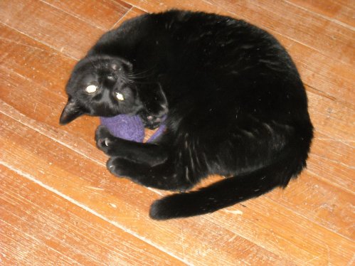 He has been alternating between playing with the mouse, rubbing up against my legs and purring (thanking me for the new toy) and sleeping. He hasn’t been this quiet and subdued in a while.