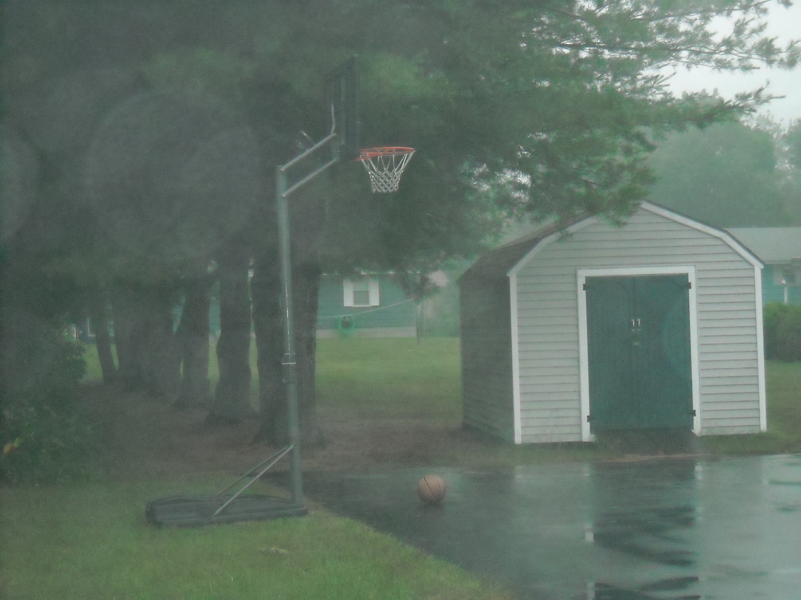I am not sure why this happened. It is raining out but it has rained in the past month and the basketball never moved. We even had a very powerful thunderstorm with high winds and heavy rains pass through last Thursday and it never budged. This morning there is a light rain falling and somehow that loosened things enough that the basketball fell. I woke up to the sound of the basketball hitting the pavement and bouncing twice.